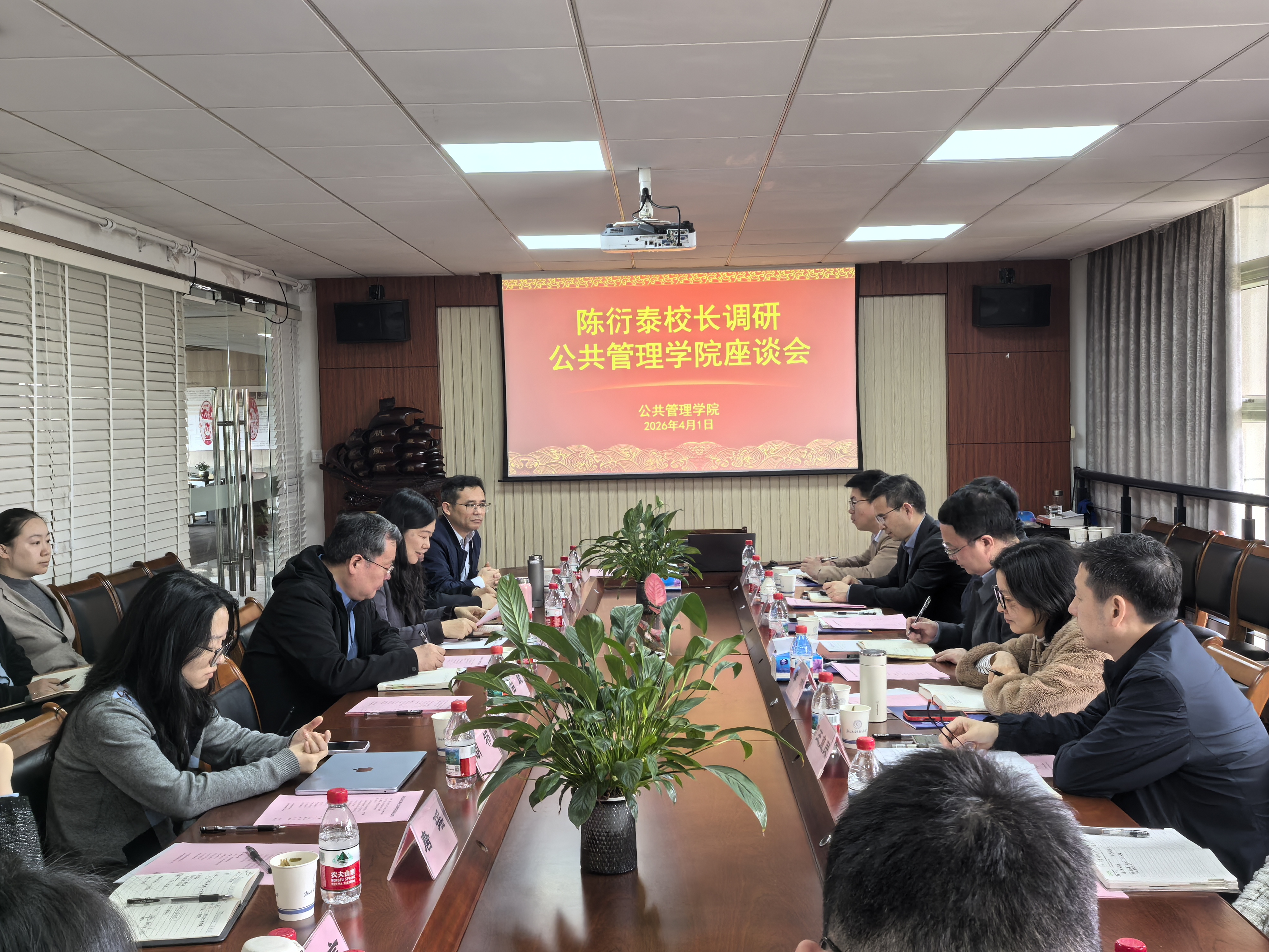 4月1日,校长、党委副书记陈衍泰赴公共管理学院调研指导,学校办公室、人才办、人事处、教务处、科研处、研究生院、社会合作处等部门负责人陪同。学院班子成员、系办代表、教师及学生代表共同参加调研座谈。