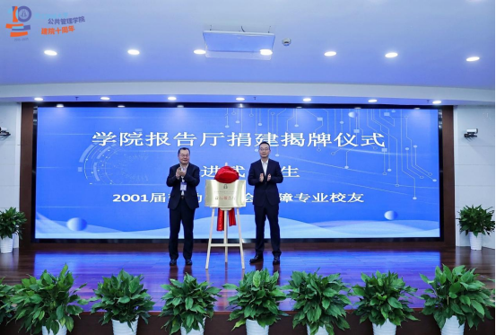 2001届社保专业校友、一二三耶集团董事长叶进武先生与公共管理学院史云贵院长共同为新命名的学院“益行报告厅”揭牌。