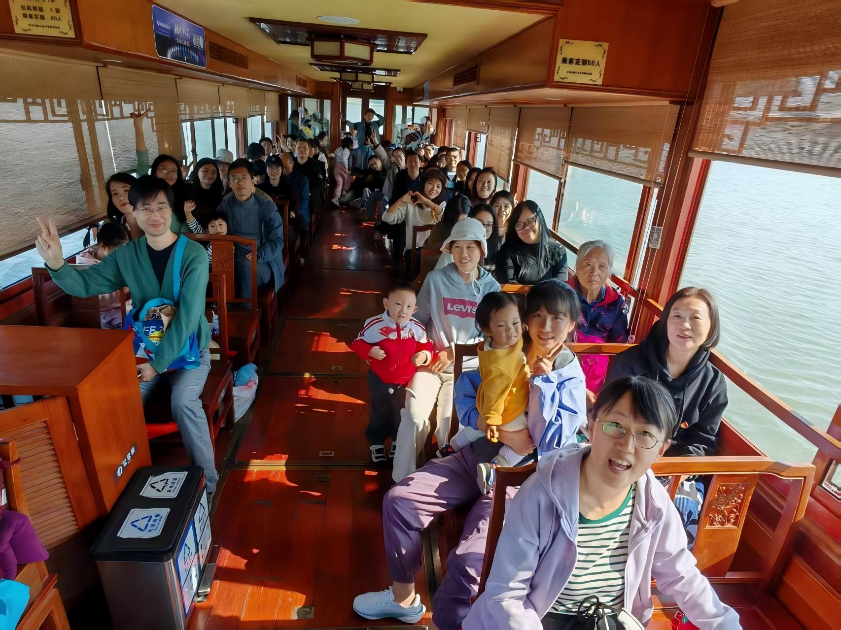 离开书院,大家乘坐古色古香的画舫船开启湖上游览。湘湖作为“西湖的姊妹湖”,秋日风光格外迷人:湖面波光粼粼,倒映着两岸层林尽染的树木,红枫、银杏与翠绿的松柏交相辉映,构成一幅流动的山水画卷。船行其间,教师们凭栏远眺,时而被远处跨湖桥遗址的古朴轮廓吸引,时而为掠过水面的水鸟驻足,清风拂面,心旷神怡。途中,导游详细介绍了湘湖的历史传说与生态保护成果,让大家在欣赏自然美景的同时,也感受到了当地对文化遗产与生态环境的珍视。