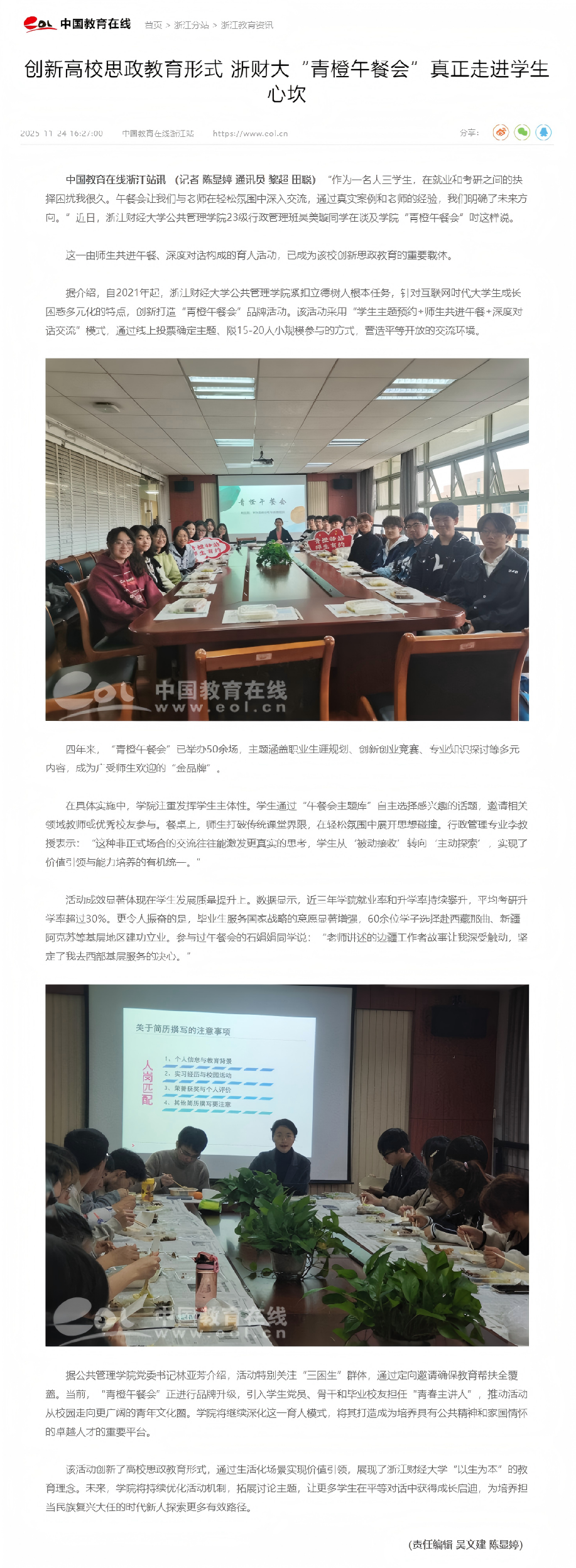 媒体聚焦|创新高校思政教育形式 浙财大“青橙午餐会”真正走进学生心坎
