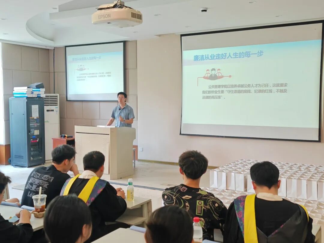 6月18日下午,公共管理学院在1-208报告厅召开2024届毕业生廉洁从业教育大会暨毕业生离校教育会,公共管理学院党委副书记、纪委书记田聪、组织员邵静、辅导员以及2024届全体毕业生出席此次会议,会议由学办主任黎超老师主持。