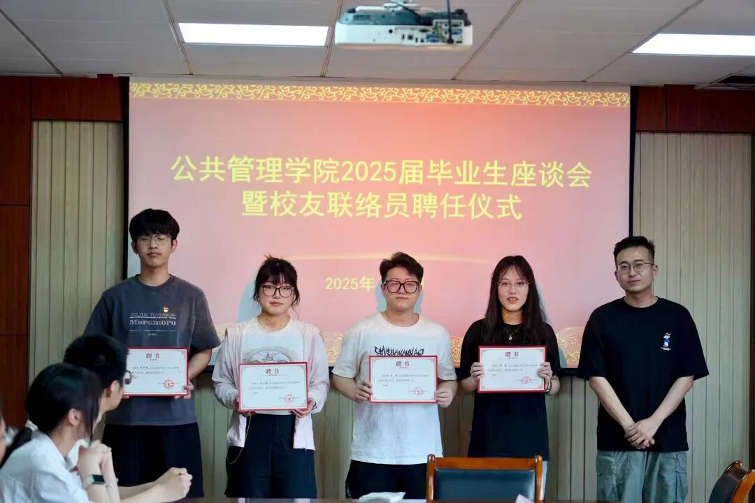 6月4日下午,公共管理学院于1-517C会议室举行2025届本科毕业生座谈会暨校友联络员聘任仪式。公共管理学院党委副书记田聪、教师代表、辅导员,以及2025届毕业生代表和校友联络员共同参与了此次活动,座谈会由党委副书记田聪主持。