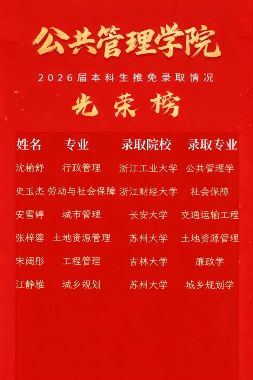 杏坛花满,佳音络绎,再次迎来硕果盈枝的时节。公共管理学院2026届推免喜讯传来:六位学子手握“通行证”,悉数叩开理想学府的大门。