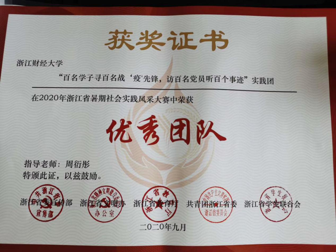 我院“百名学子寻百名战‘疫’先锋,访百名党员听百个事迹”实践团,在2020年浙江省暑期社会实践风采大赛中荣获“优秀团队”。
