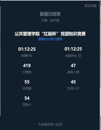 此次知识竞赛,增强了学生对党团知识的了解,深化了对党的认识,体现了我院学生积极向上的状态。启示学生要铭记历史,不忘初心,永远追随党的领导,肩负为实现中华民族伟大复兴而努力奋斗的使命,书写中国辉煌。