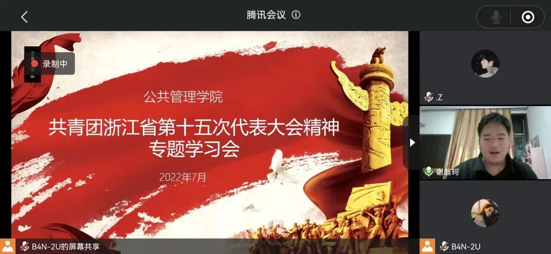 公共管理学院学生会执行主席郭晓雨带领学院青年学习体会共青团浙江省第十五次代表大会精神,介绍了会议基本情况及省委、团中央领导讲话精神和工作报告的主要内容,向青年同志传达贯彻省第十五次团代会精神的几点要求。