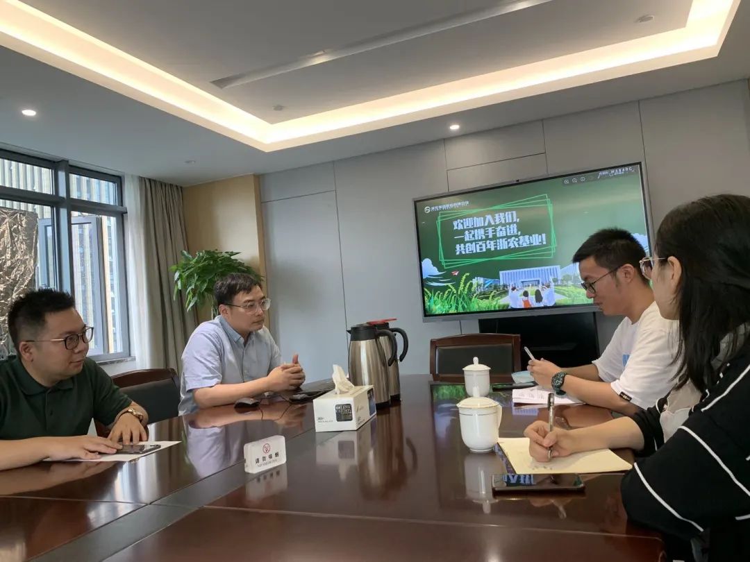 随后,实践服务团与浙农集团团委副书记王剑军老师和周晨辉校友在浙农科创园会议室内进行座谈。王剑军副书记和周晨辉校友对实践服务团队成员的到来表示欢迎,周学长在座谈会上详细介绍了集团的主营业务、上市情况和人才培养等,并详细阐述了五大智慧涉农平台的建设情况;王书记针对新冠疫情之下如何发展浙农农资事业和转型浙农业务领域的智慧农业、汽车商贸等板块进行了详细解答。团队成员还了解到,浙农集团为抓住国民经济发展热点,不断开拓多元业务,提升企业的经济效益。最后,王书记指出,在经济全球化的大背景下,浙农主打的以农业综合服务,汽车商贸服务及相关主业供应链金融为主营业务的体系正发挥着巨大的作用。