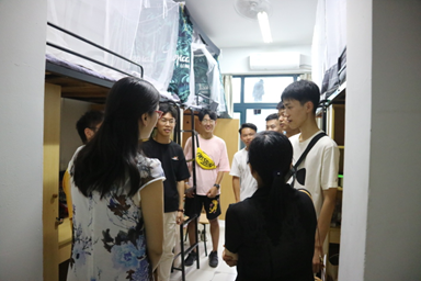 在一整天的迎新活动结束之后,为了解我院新生在校住宿条件和生活状况,31日下午3点,院党委书记沈晓敏,院党委副书记程晓东、副院长王直民、学办主任杨文超、团委书记余亮、辅导员边华菁,在四位新生班主任及班导的陪同下到达成蹊苑、桃李苑对新生寝室进行了实地走访,