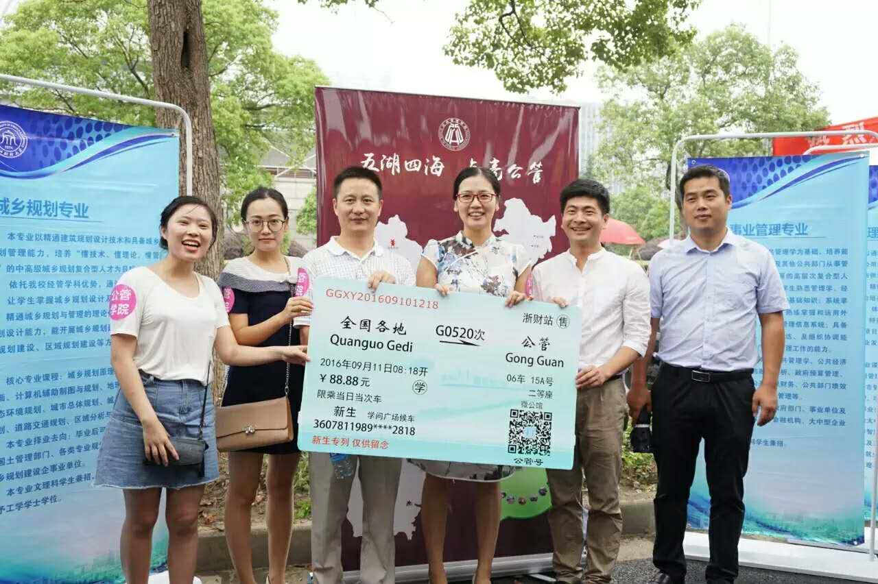 8时许,2016级新生接踵而来。在志愿者的引领下,新生和家属来到由新生各班班导为主要力量的报到处,注册登记后,新生们领着大礼包来到横幅前拍照留念,一张类似火车票的牌子,由“全国各地”驶向“公管”的公管号列车寓意十足。背景是一幅全国、全省地图,每一名报道的新生都会贴上一颗红色五角星,新生在全国各地的分布情况和报道情况尽收眼底,更加凸显出我院新生“五湖四海”的特点。学院领导亲临现场慰问工作人员,并与新生一起合影留念,现场气氛热烈,拍立得的现拍效果更得到新生和家长们的一致喜爱。
