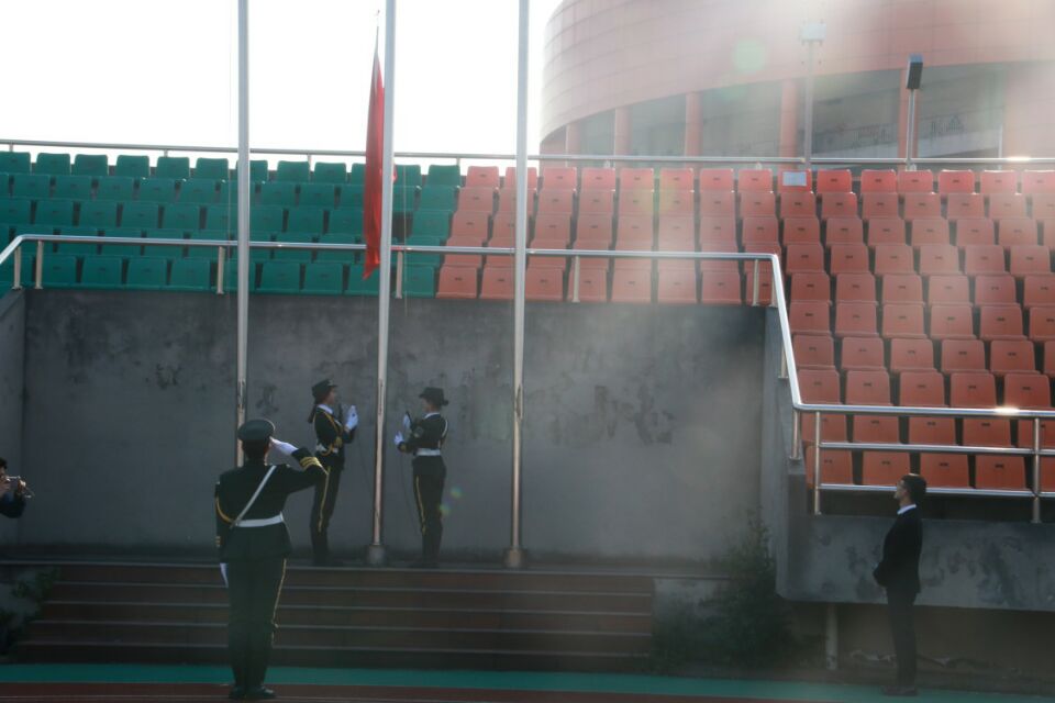 本次升旗仪式由16公管林成富同学主持。随着一声嘹亮的口号 “立正!”,升旗仪式正式开始。校国旗护卫队脚踏坚定的步伐,逐步穿过人群,来到升旗台下。随着熟悉的乐音响起,全体学生行注目礼,看鲜艳的五星红旗又一次缓缓升起,庄严而又神圣。