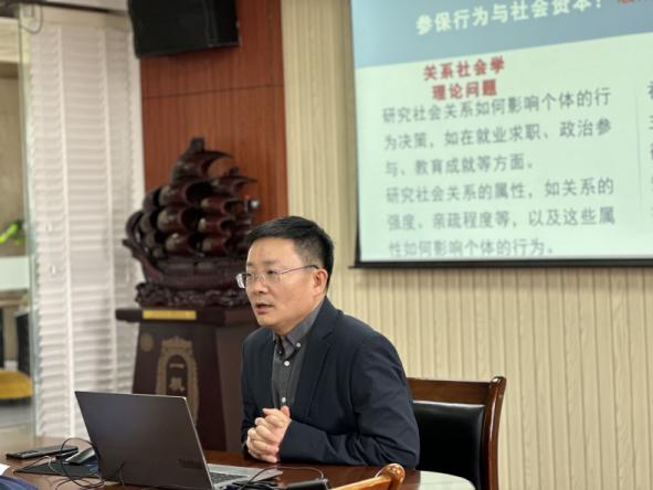 讲座开始,吴教授从社会保障实践与关系社会学理论切入,阐释我国多层次养老保险体系存在低覆盖、低档次、高断保等现实问题,说明以关系嵌入性视角研究参保行为的理论与现实意义。