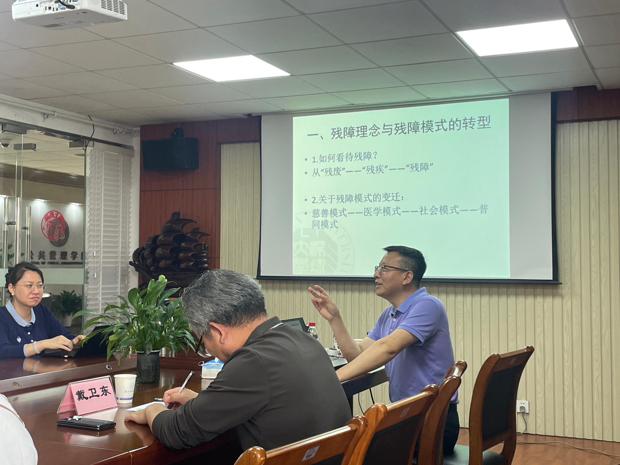 2026年4月10日,深圳大学政府管理学院教授、博士生导师周林刚教授应邀莅临我院开展题为《残障理念转型与政策赋能机制探讨》的学术讲座。讲座由戴卫东教授主持,我院相关专业教师及研究生共同参与。