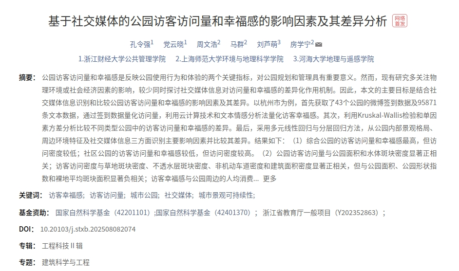 论文题目:基于社交媒体的公园访客访问量和幸福感的影响因素及其差异分析
