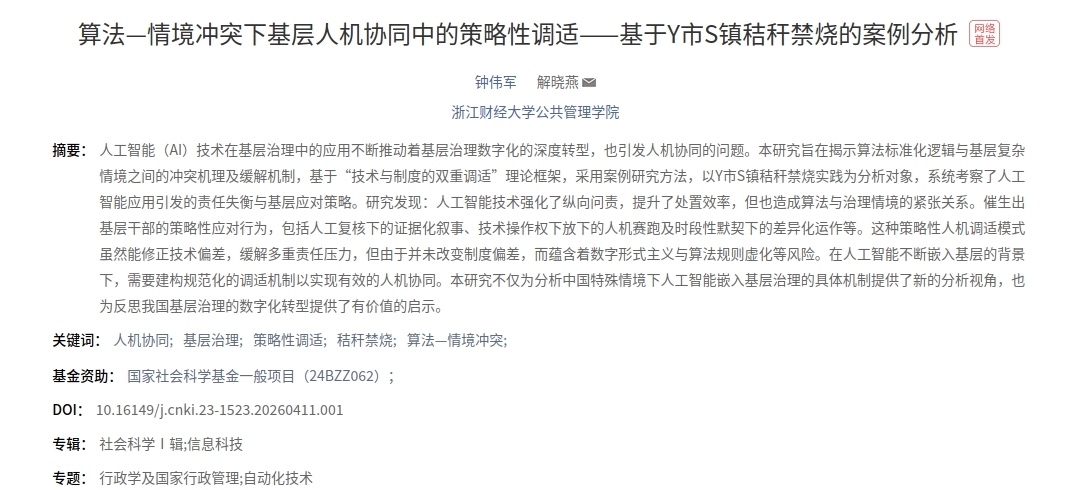 我院行政管理系教师钟伟军和博士生解晓燕撰写的论文《算法—情境冲突下基层人机协同中的策略性调适——基于Y市S镇秸秆禁烧的案例分析 》被《公共管理学报》录用并发表。