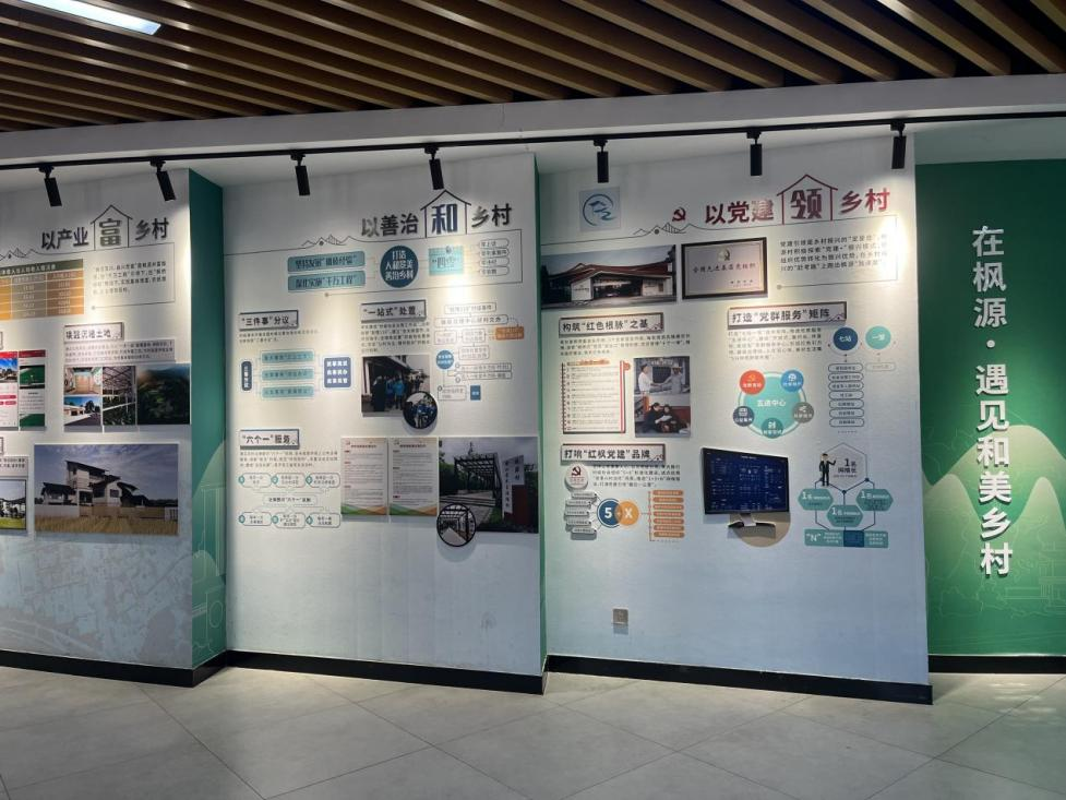 走进枫源村文化礼堂,一幅幅记录乡村变迁的照片、一张张彰显治理成效的图表引人驻足。墙上“零上访、零刑事案件、零违纪、零邪教”的“四零”目标与“三事分议”“三上三下”等治理机制介绍,生动展现了该村传承发展“枫桥经验”的创新实践。调研团队认真聆听讲解,详细了解该村从“矿山经济”到“生态文旅经济”的转型历程,以及“千万工程”引领下的乡村蝶变。